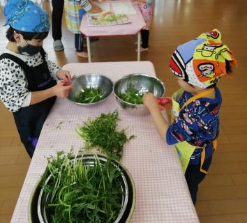 今日も一日がスタートしました。ビオトープのオタマジャクシやカエルにも、畑のダンゴムシにも命がある事を先生達が教えてくれています。さて、5月はたくさんの旬の味をいただきました。山菜摘みに行かせていただいたり、いちごやそら豆をたくさんいただきました。