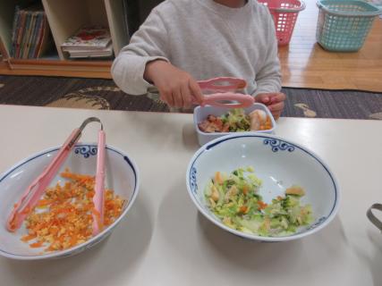 3歳以上児は自宅からお弁当箱を持って来て自分でごちそうをお弁当箱の中に入れます。自分で考えて入れるのって楽しいですよね。食べること大好きな子どもたちに育ってほしいです。