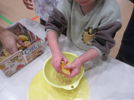 すみれ組は1/27日より自分たちのお部屋に引っ越しをして、午睡もなくなりました。1.2.3.4歳児もお部屋が変わったり、カバンをかける場所がかわるなど、新年度に向けて移行しています。 今日のすみれ組は午後よりクッキングでみんなのおやつのコロコロクッキーを作ってくれました。